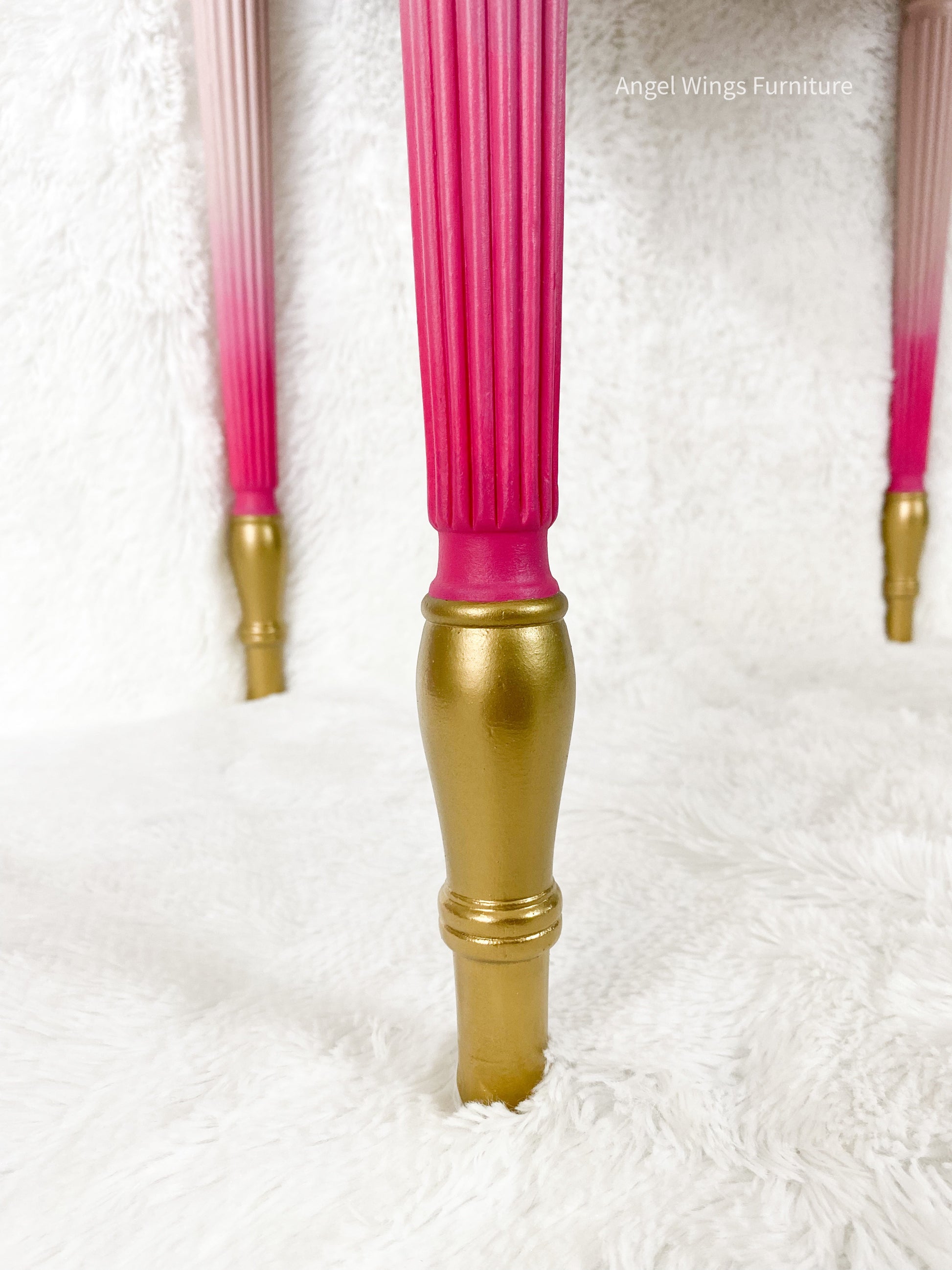 This classic Federal-style vintage Brandt Furniture of Character of Hagerstown table is fit for a princess. Given a beautiful ombre-inspired finish, this vintage gem now features a blended pink and gray finish paired with an artistic white, pink, gray, and gold fluid paint pour top. Matching gold hardware and coordinating gold feet give this vintage treasure the jewels she deserves. The interior drawers have been hydrated and refreshed. The entire piece has been sealed for added protection from wear over time.
